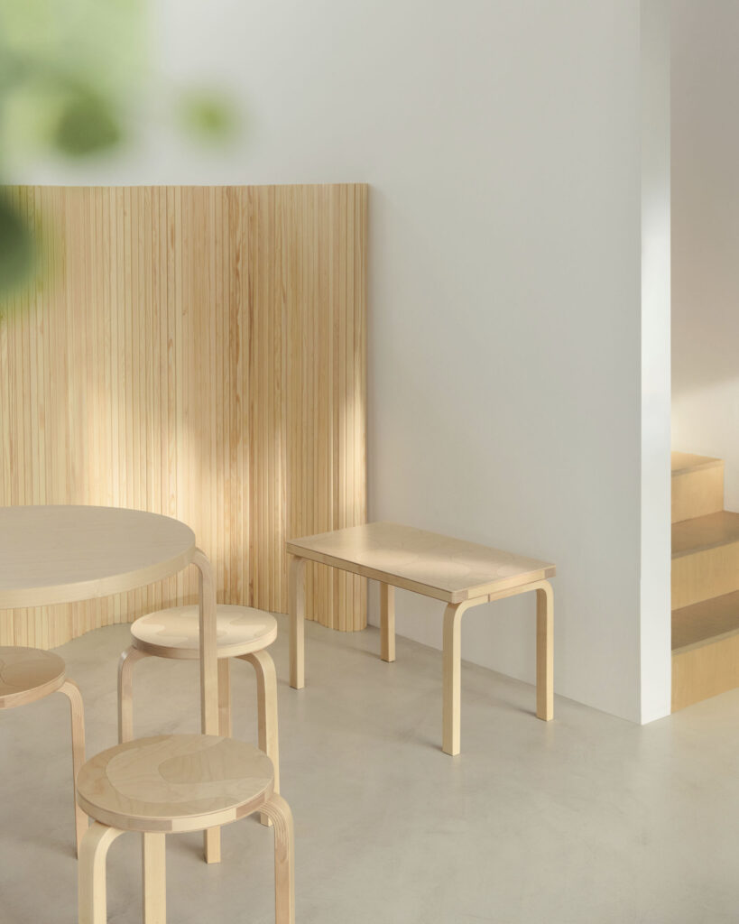 Artekin kalusteiden minimalistinen muotoilu ja monikäyttöisyys istuvat täydellisesti Marimekon rohkeaan ja värikkääseen maailmaan. Marimekon ikoneihin lukeutuvat Maija Isolan suunnittelemat kuviot yhdistyvät Alvar Aallon jakkaran 60, pöydän 90D ja penkin 153B pelkistettyihin muotoihin.